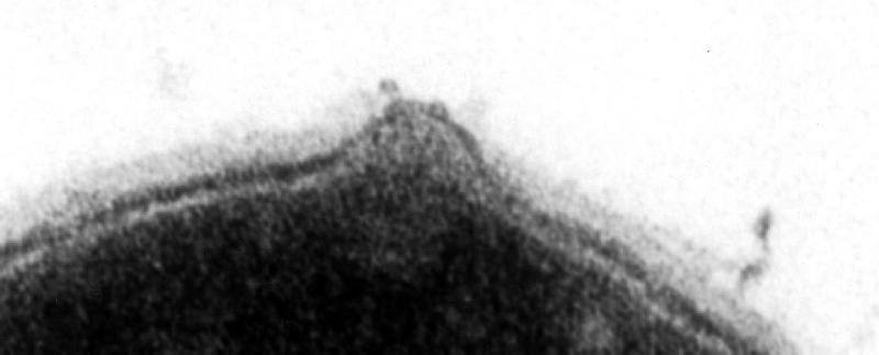 Seconds after treating S. pyogenes with PlyC lysin a weakness is seen in the cell wall showing the membrane beginning to push through.