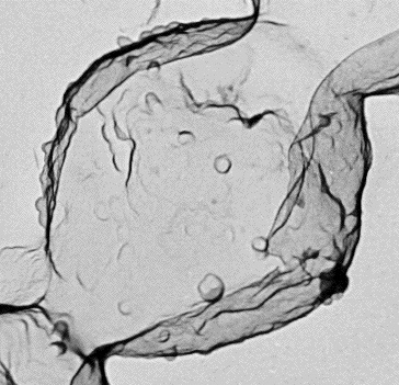 High magnification transmission electron micrograph (TEM) of a tantalum and tungsten surface replica of a critical point dried streptococcus within a chain of cells. This cell treatment produces projections on the cell surface. Loss of these surface projections by cell treatment with trypsin is consistent with their being comprised of cell surface proteins. Strain: D471; M-type 6.